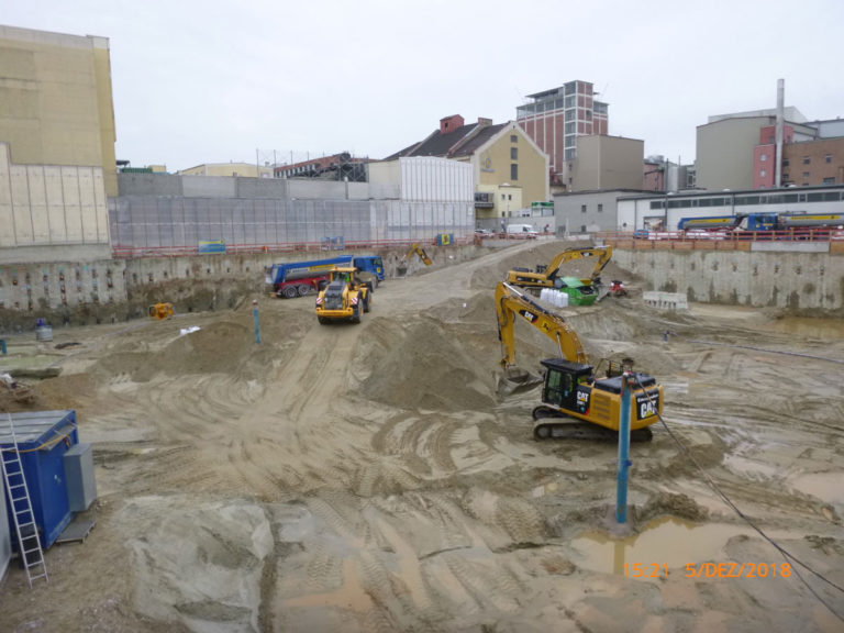 Nach dem bauseitigen Einbringen eines umlaufenden Verbaus erfolgt der Abbruch der unterirdischen Bausubstanz, Aushub der Baugrube und Bodensanierung. BA2