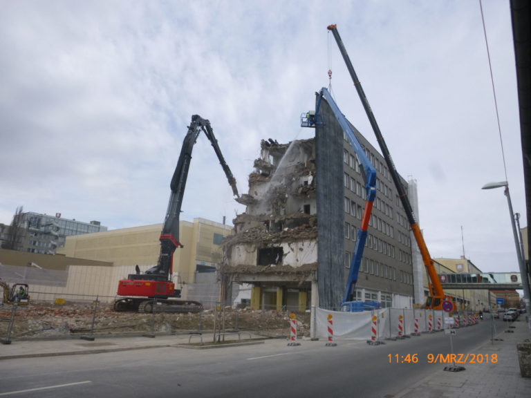 - Umfangreiche Schutzmaßnahmen z.B. Abbruchschutzgerüst bzw. Abbruchmatte mit Autokran, Staubschutzverhängung;