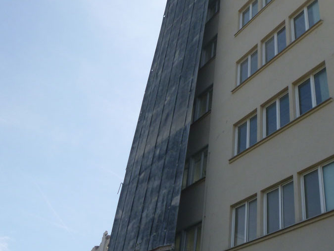 - Umfangreiche Schutzmaßnahmen z.B. Abbruchschutzgerüst bzw. Abbruchmatte mit Autokran, Staubschutzverhängung;